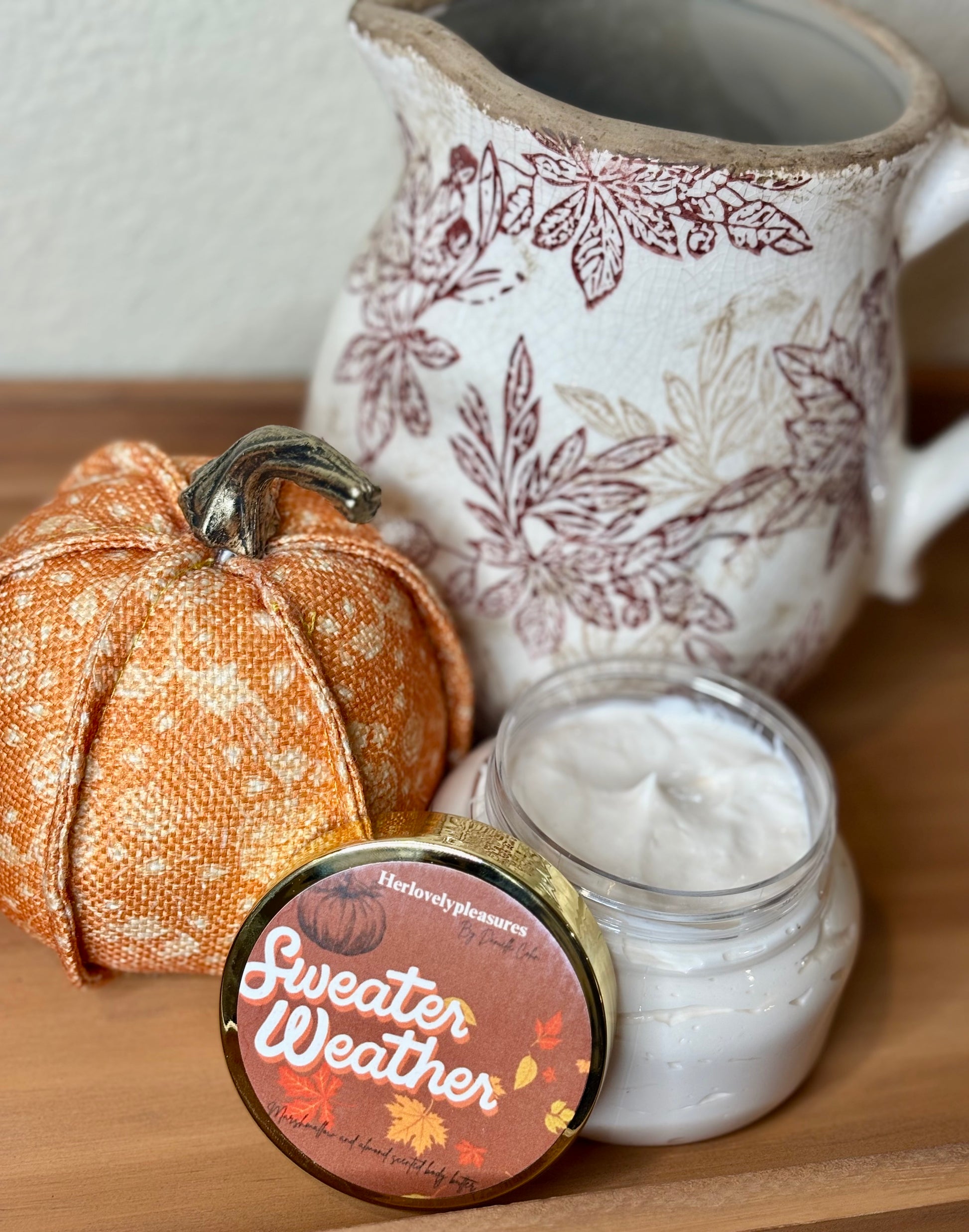 Our seasonal sweater weather body butter is our amazing Shea butter and aloe base with notes of marshmallow, almond, vanilla, and musk to have you smelling like all of the warm and cozy fall vibes!! With its blend of all natural and organic ingredients it ensures healthy skin and leaves your skin, feeling hydrated and moisturized all day!🍁✨