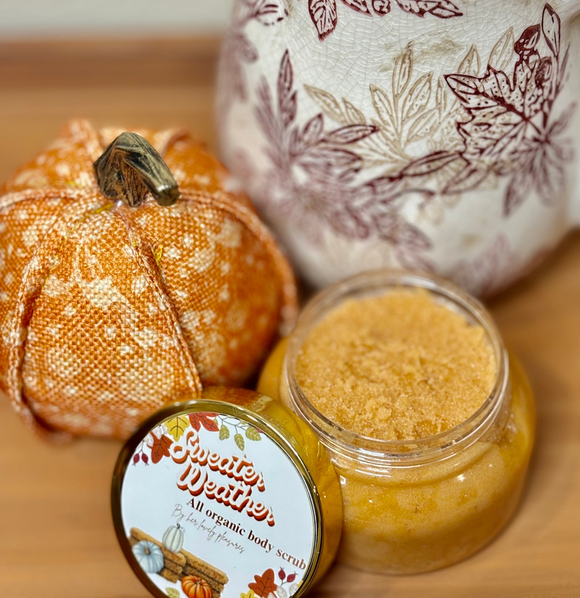 Sweater weather body scrub! Our seasonal sweater weather body scrub is part of our seasonal favorite collection! It’s a sugar scrub infused with a blend of oils to exfoliate and hydrate the skin! It’s the perfect body care item with a seasonal twist! 😻